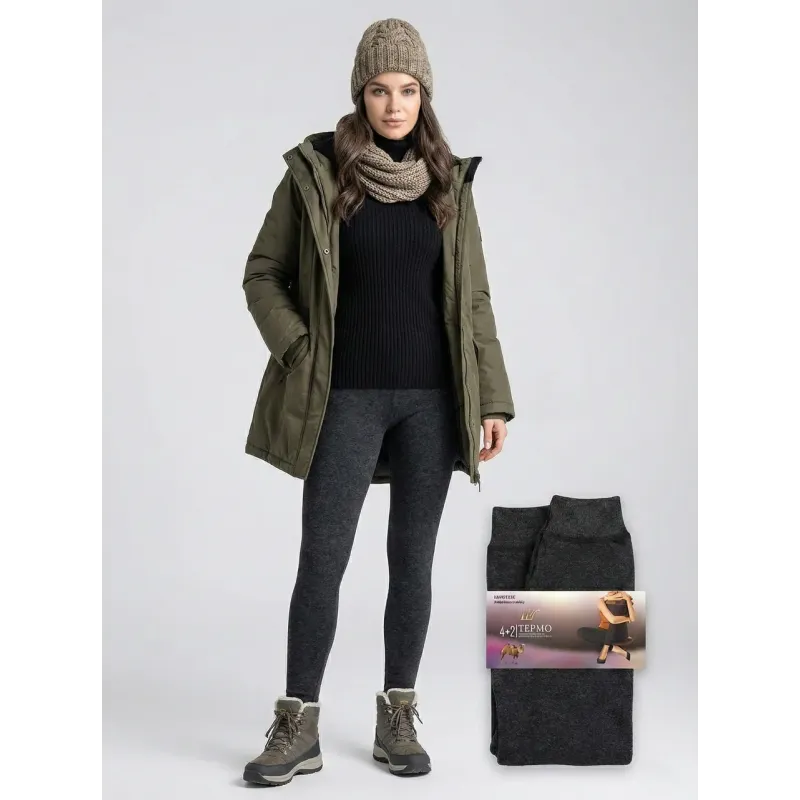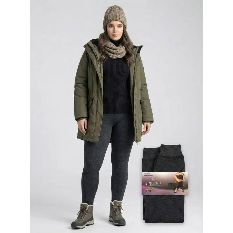 Забудьте про холод і незручні колготки! Представляємо модель зимових лосин, розроблену спеціально для жінок з пишними формами, які шукають максимальне утеплення. Ці легінси серії "Camel Wool" (Верблюжа вовна) — справжній порятунок у морозні дні. Переваги цієї моделі: Супер-об'єм: Маркування 8XL вказує на збільшену розмірну сітку (Батал). Вони чудово тягнуться в ширину, мають зручну глибоку посадку та не сповзають під час ходьби. Термоефект: Внутрішня сторона покрита густим, приємним на дотик хутром чорного кольору, яке створює повітряний прошарок і утримує тепло тіла краще за звичайний фліс. Практичний дизайн: Зовнішня тканина кольору "антрацит" (темно-сірий) має гладку, щільну структуру, стійку до зачіпок. Такий колір візуально стрункіший і менш маркий, ніж чорний. Універсальність: Завдяки відсутності зайвих швів та декору, їх можна носити як самостійні штани з тунікою чи светром, або піддягати під лижний костюм. Характеристики: Розмір: Універсальний Батал (на бірці 8XL, орієнтовно 50-56) Склад: Бавовна, Поліамід, Еластан (з додаванням вовни) Утеплення: Товсте штучне хутро Колір: Темно-сірий меланж Сезон: Зима (до -25°C)